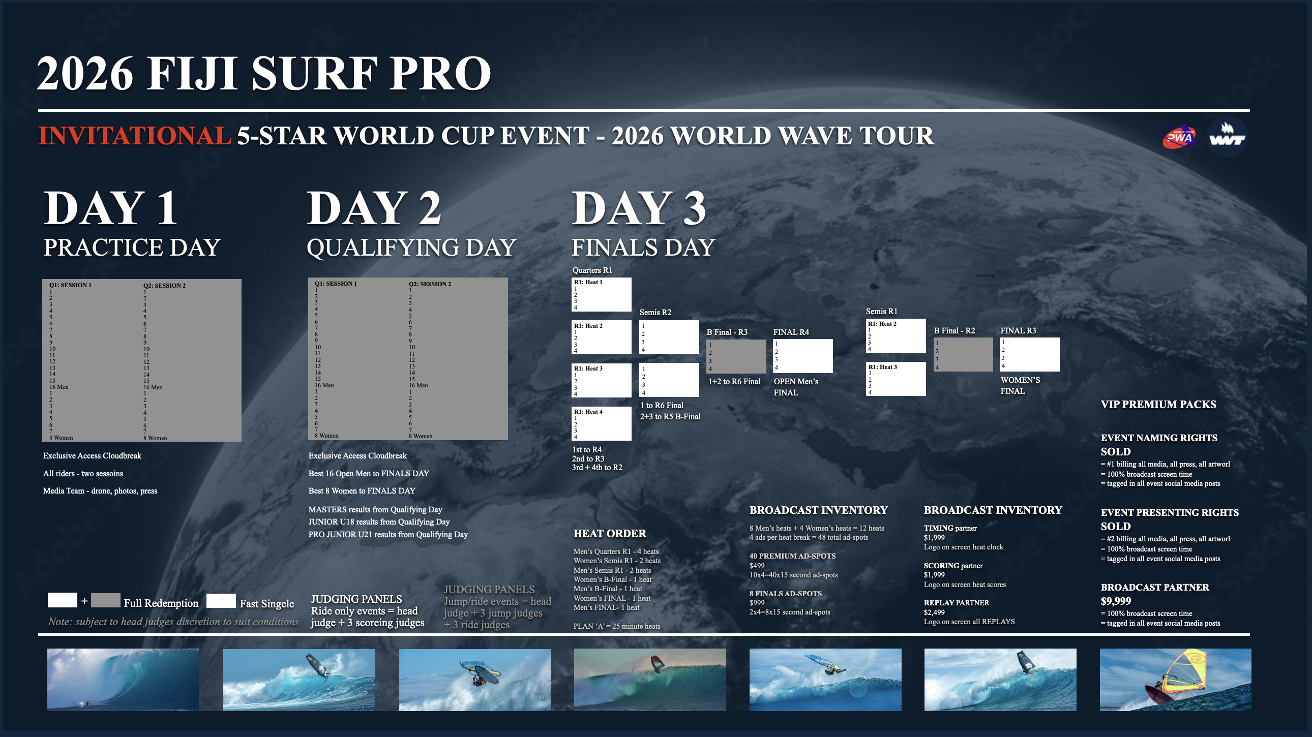 Above: the new 4-STAR Fiji Surf Pro Invitational 3 day event format - if conditions allow, all riders will be out on DAY1 and DAY 2 and then the best of the best on DAY 3 for Finals Day